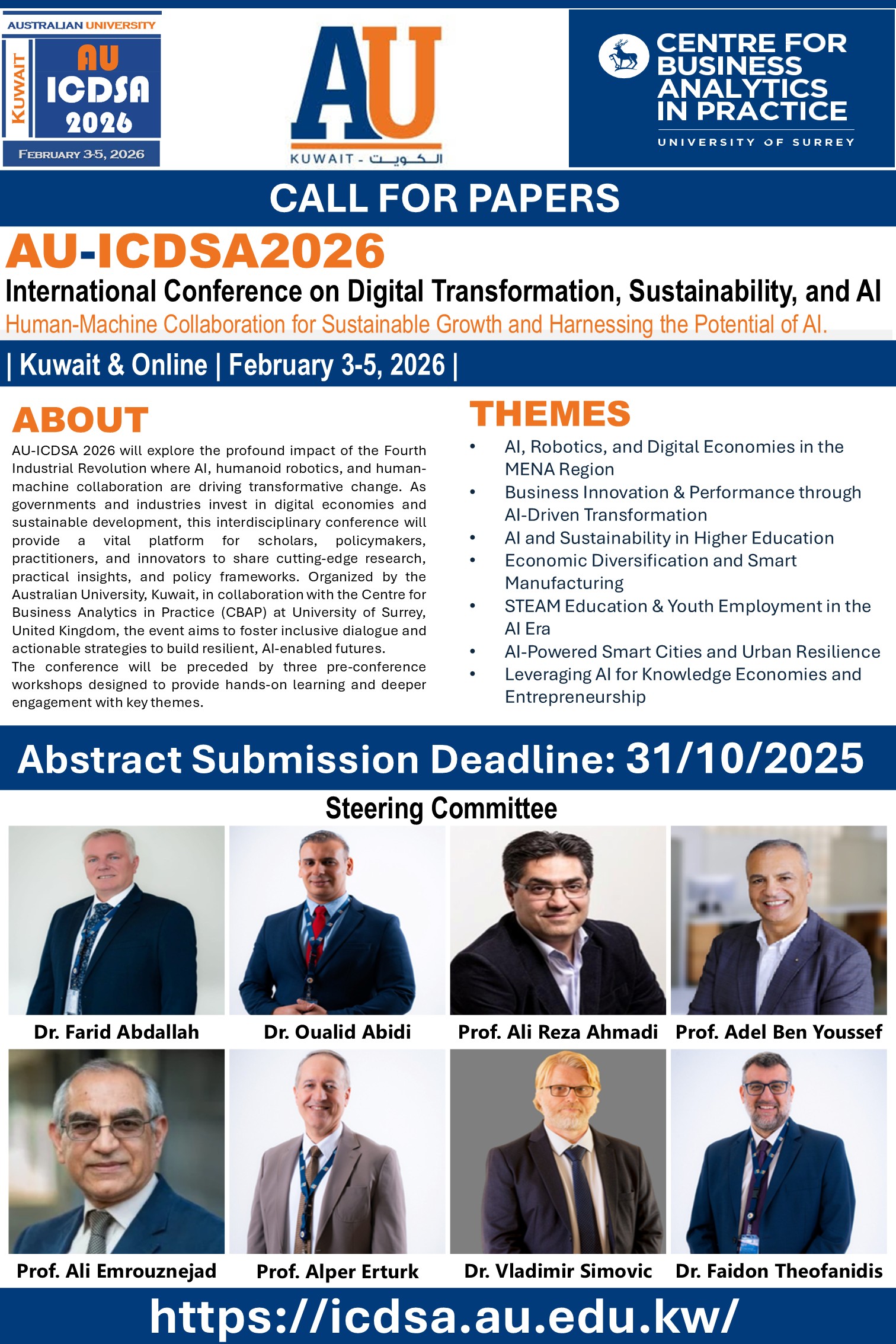 About AU-ICDSA 2026 will explore the profound impact of the Fourth Industrial Revolution where AI, humanoid robotics, and human-machine collaboration are driving transformative change. As governments and industries invest in digital economies and sustainable development, this interdisciplinary conference will provide a vital platform for scholars, policymakers, practitioners, and innovators to share cutting-edge research, practical insights, and policy frameworks. Organized by the Australian University, Kuwait, in collaboration with the Centre for Business Analytics in Practice (CBAP) at University of Surrey, United Kingdom, the event aims to foster inclusive dialogue and actionable strategies to build resilient, AI-enabled futures. The conference will be preceded by three pre-conference workshops designed to provide hands-on learning and deeper engagement with key themes. Themes • AI, Robotics, and Digital Economies in the MENA Region • Business Innovation & Performance through AI-Driven Transformation • AI and Sustainability in Higher Education • Economic Diversification and Smart Manufacturing • STEAM Education & Youth Employment in the AI Era • AI-Powered Smart Cities and Urban Resilience • Leveraging AI for Knowledge Economies and Entrepreneurship Best regards Ali Emrouznejad, BSc, MSc, PGc, PhD, FIMA Professor and Chair in Business Analytics Director, Centre for Business Analytics in Practice (CBAP) |