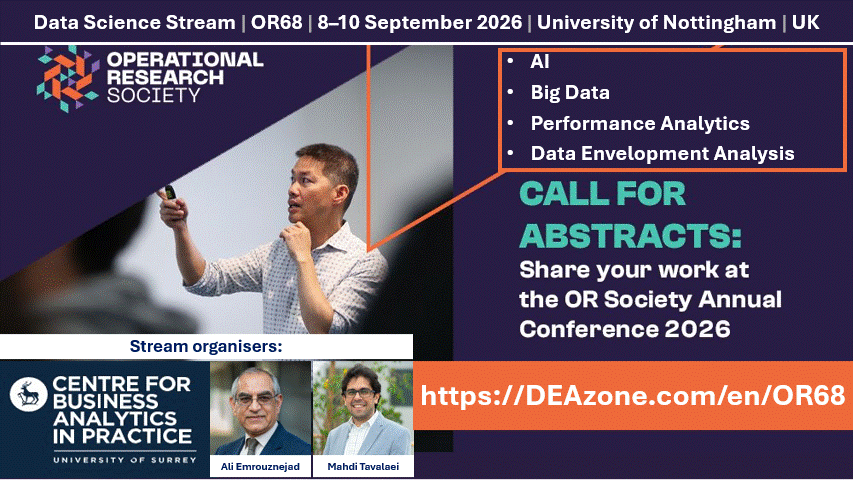 We would like to invite you to submit an abstract to the Data Science Stream: AI, Big Data, and Performance Analytics (Data Envelopment Analysis – DEA) at OR68 – The OR Society Annual Conference 2026, taking place on 8–10 September 2026 at the University of Nottingham, UK.
