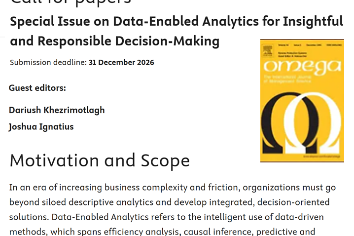 Call for Papers: Special Issue of OMEGA Special Issue on: “Data-Enabled Analytics for Insightful and Responsible Decision-Making”Submission Deadline: 31 December 2026Submission Opens: 10 November 2025 Guest Editors:Prof. Dariush KhezrimotlaghSchool of Science, Engineering, and Technology,Pennsylvania State University – Harrisburgdk@psu.edu Prof. Joshua IgnatiusDepartment of Business Analytics and Information Systems,Aston Business School, Aston University (UK)j.ignatius@aston.ac.uk Motivation and Scope …