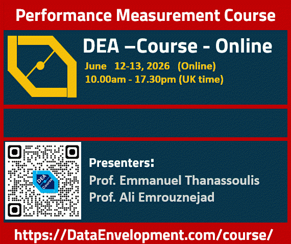 Online DEA Course: Performance Measurement Using Data Envelopment Analysis (DEA) Details: https://dataenvelopment.com/course/ DATA ENVELOPMENT ANALYSIS COURSE:June, 2026 For registration and further details please visit: https://dataenvelopment.com/course/ Early registration fee: April 30, 2026 Join our Performance Measurement courses on Data Envelopment Analysis (DEA) led by renowned experts Prof. Emmanuel Thanassoulis, and Prof. Ali Emrouznejad DEA Course: